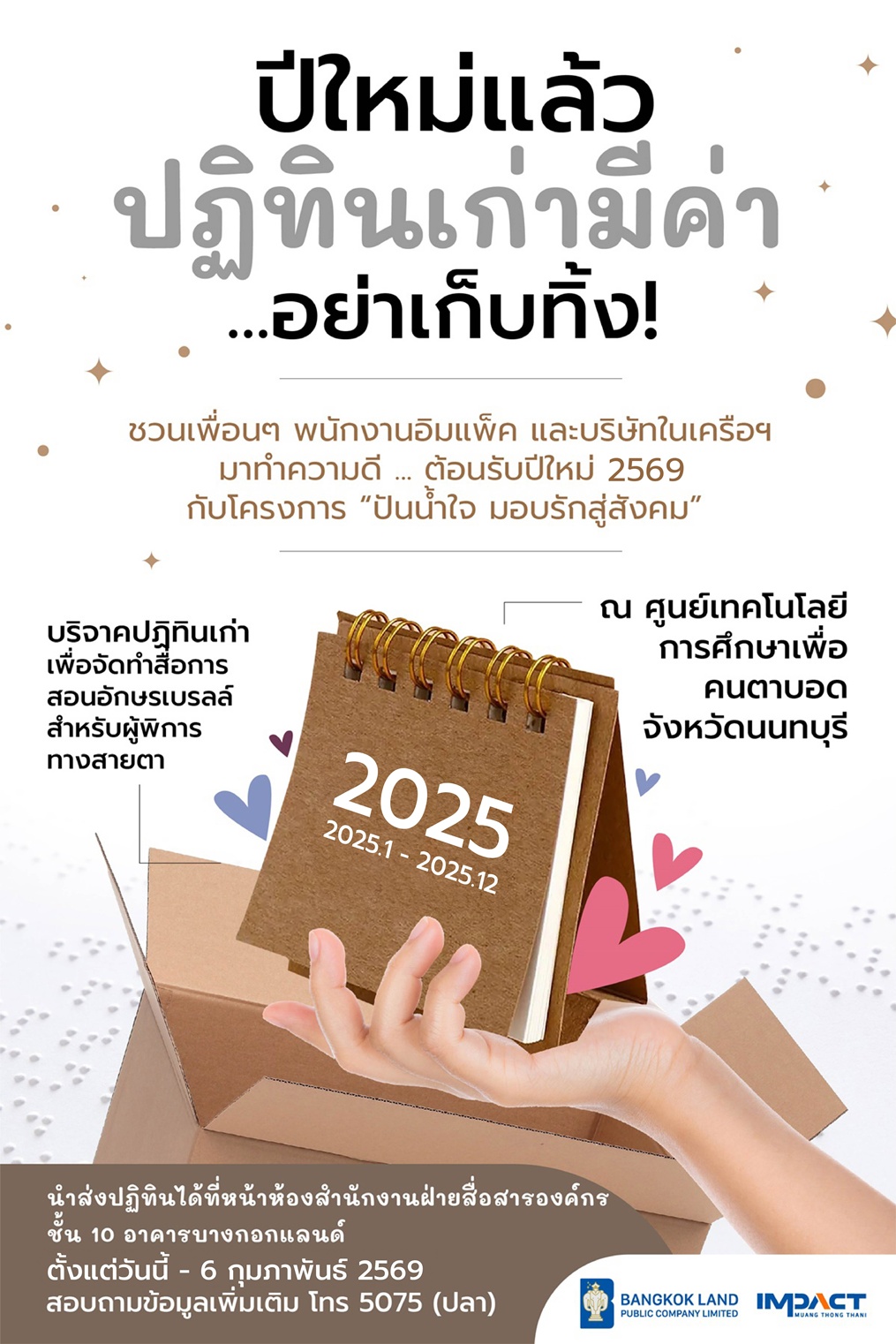 Did you know that an old calendar is still in good use so don’t throw it away! IMPACT Insight would like to invite everyone to donate an old calendar to produce teaching materials for blind people at Educational Technology for the Blind Center, Nonthaburi.