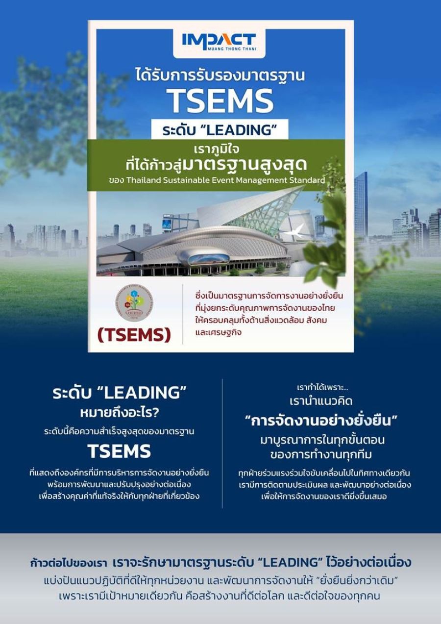 อิมแพ็ค พร้อมก้าวเป็นผู้นำด้านการจัดงานอย่างยั่งยืนในประเทศไทย การันตีด้วยการรับรองมาตรฐาน TSEMS ระดับ LEADING ซึ่งเป็นมาตรฐานสูงสุดเคล็ดลับความสำเร็จครั้งนี้คืออะไร...