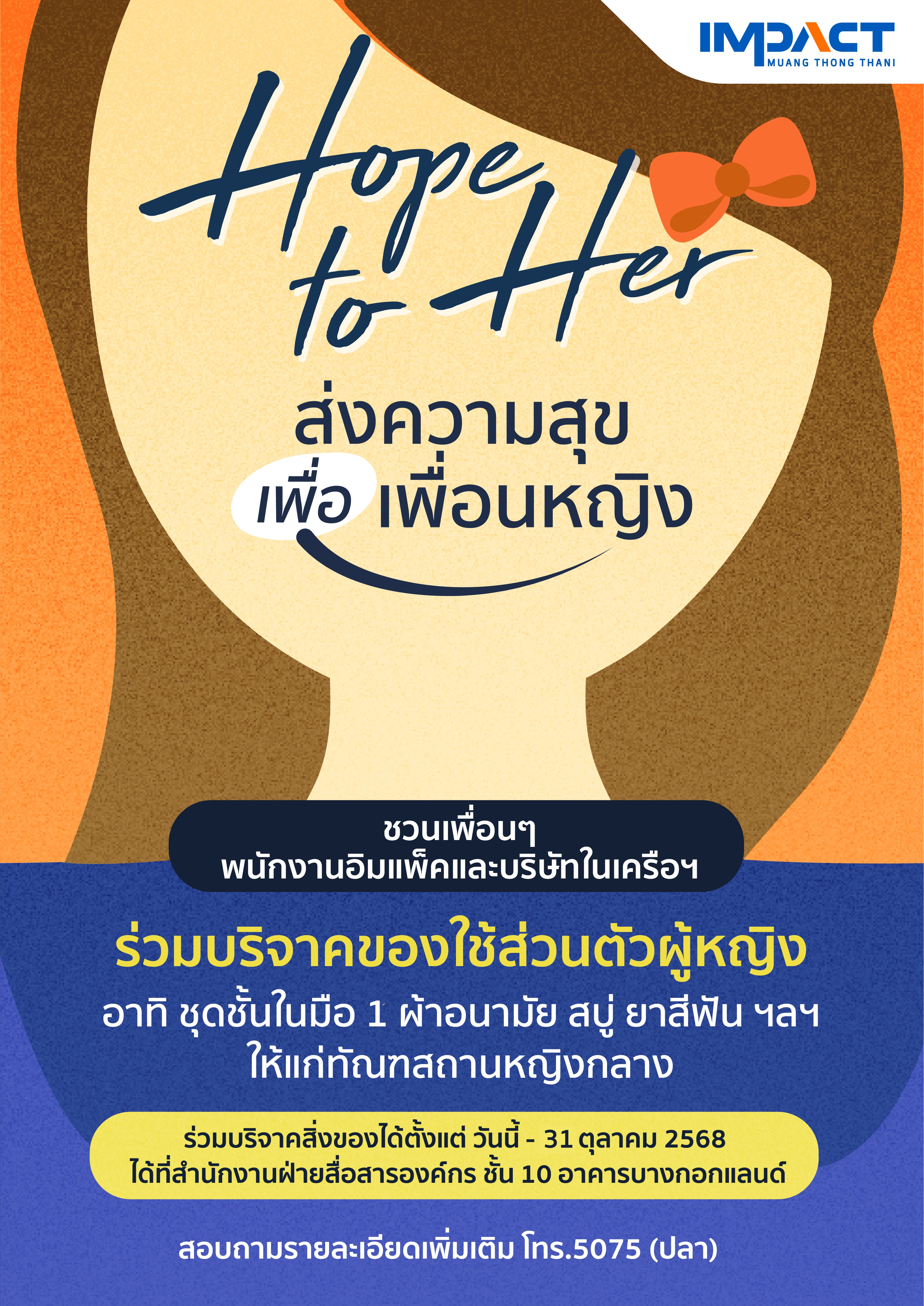 "Hope to Her ส่งสุขเพื่อเพื่อนหญิง” กิจกรรมบริจาคสิ่งของ เพื่อผู้ต้องขังหญิง ณ ทัณฑสถานหญิงกลาง ภายใต้โครงการ ปันน้ำใจ มอบรักสู่สังคม ชวนเพื่อนๆ ชาวอิมแพ็คมาร่วมส่งต่อความสุขให้แก่เพื่อนหญิงผ่านสิ่งของจำเป็นเพื่อผู้หญิง
